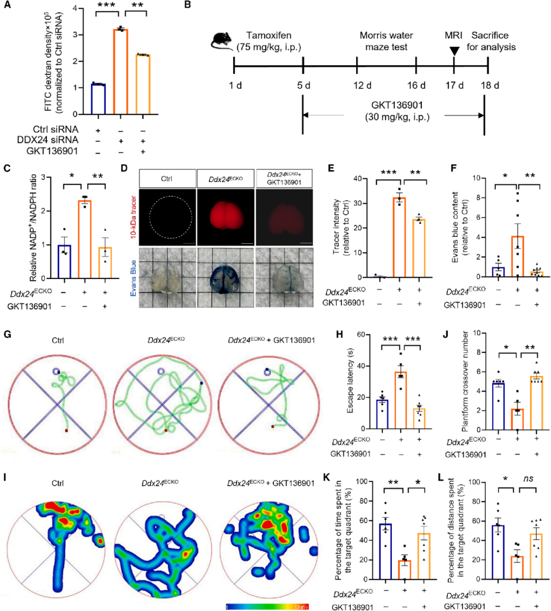 为在体内重现这一效果,将GKT136901腹腔注射给予Ddx24内皮特异性敲除小鼠。治疗后,氧化型NADPH水平显著降低。此外,该治疗明显减轻了敲除小鼠中伊文思蓝和10 kDa荧光示踪剂的血脑屏障渗漏。同时,GKT136901治疗也缓解了这些小鼠的线粒体形态异常和紧密连接结构破坏。GKT136901还挽救了因Ddx24敲除所导致的学习和记忆障碍。