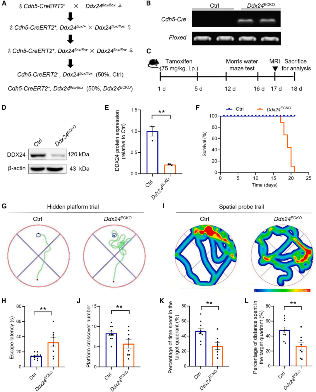 图一 小鼠内皮细胞特异性敲除Ddx24会导致学习和记忆障碍