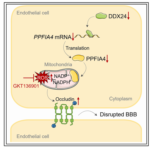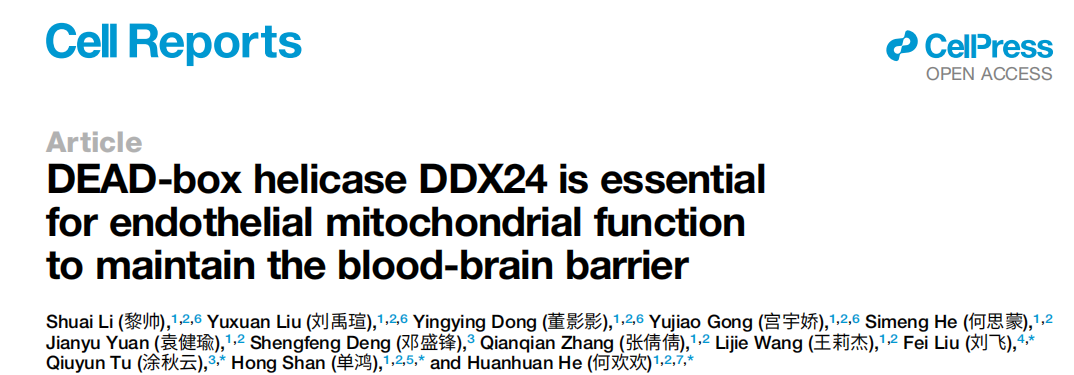 基于此,中山大学附属第五医院何欢欢&单鸿&涂秋云&刘飞研究团队在《Cell Reports》杂志发表了“DEAD-box helicase DDX24 is essential for endothelial mitochondrial function to maintain the blood-brain barrier”揭示了DEAD-box解旋酶DDX24对维持内皮细胞线粒体功能至关重要,从而保障血脑屏障的完整性。