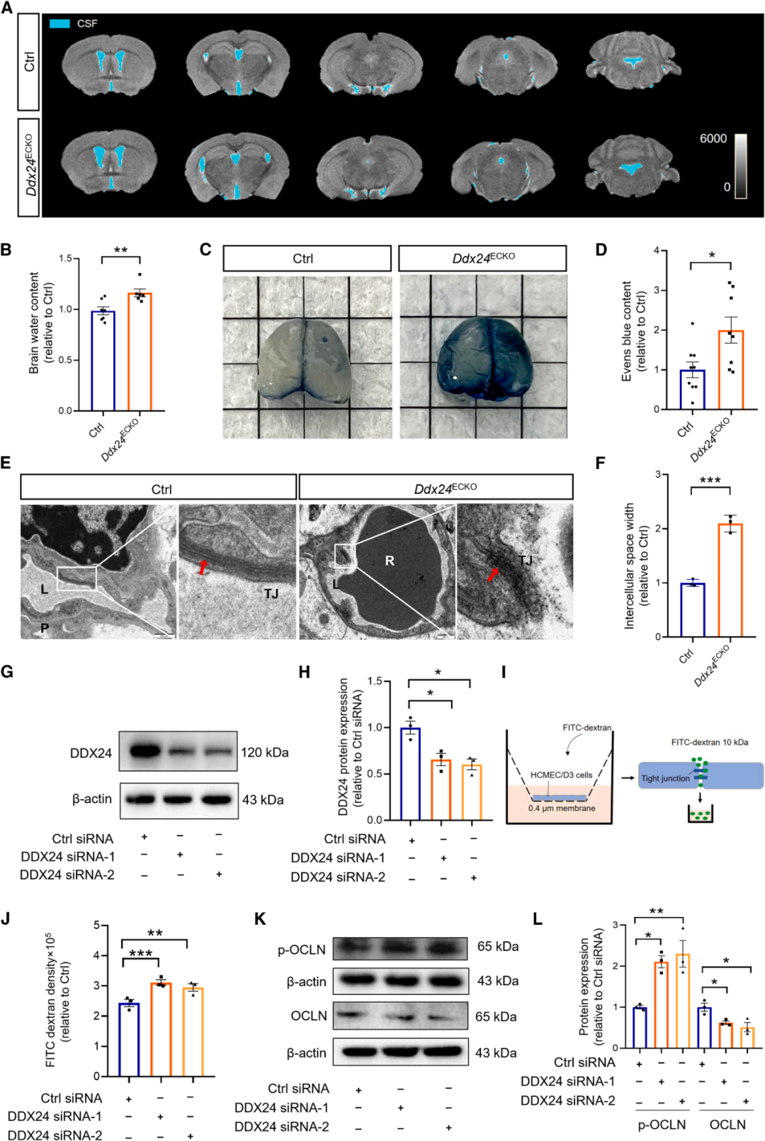 为探究Ddx24敲除导致学习记忆障碍的原因,研究人员利用9.4T小动物MRI发现:内皮特异性敲除Ddx24后,小鼠脑脊液增多、出现脑水肿,但脑血管直径未变。同时,血脑屏障通透性增加,伊文思蓝渗漏增多,紧密连接结构受损。