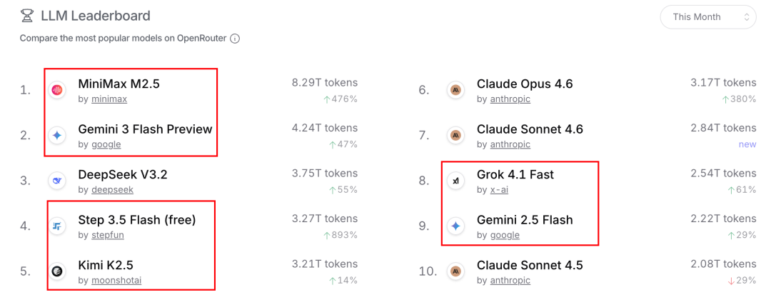 榜单Top 2席位被轻量化小模型包揽,第1名MiniMax M2.5以8.29T tokens的调用量断层领跑全榜,月度涨幅高达 476%;第2名Google Gemini 3 Flash Preview,调用量也达到4.24T tokens,远超多数通用旗舰大模型。