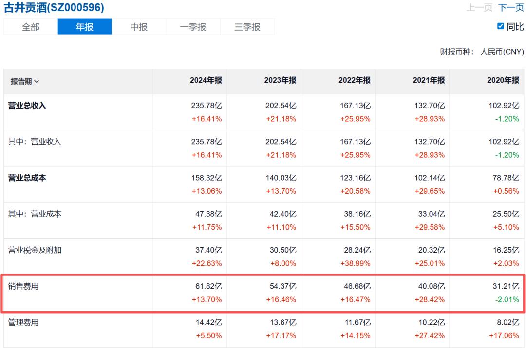 财报数据显示,古井贡酒的销售费用在2017年首超20亿元,2019年首超30亿元,2021年又超40亿元,2023年超过了50亿元,紧接着,2024年就超过了60亿元。