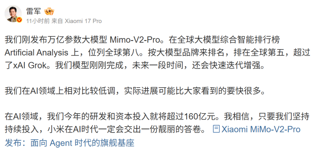 MiMo-V2-Pro的诞生,第一次让小米在纯技术维度上获得了一个全球级的排名。