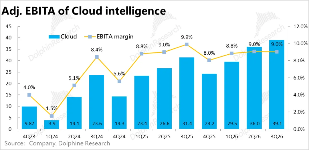 利润上,阿里云本季的adj.EBITA利润率达9%,和上季持平。虽然AI对设备和能源的要求更高,逻辑上会对利润率产生压制。但一方面可能因前算力供不应求(近几日阿里云刚宣布对部分产品提价),同时产品结构也有所优化(放弃低毛利率业务,侧重如MaaS等高毛利业务),平稳的利润率也还算不错。