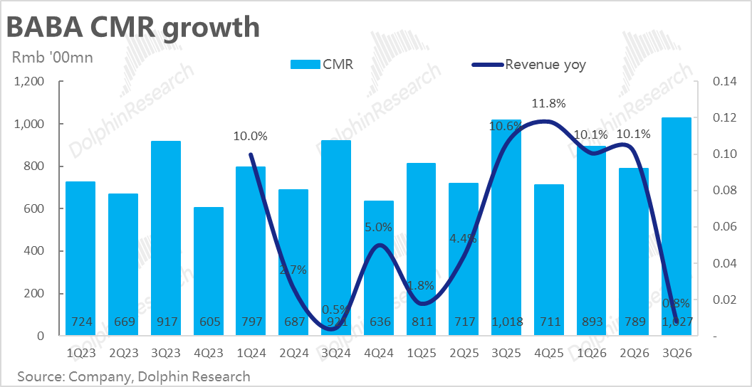 1、CMR增长不足1%:传统远场电商业务的核心指标--CMR本季同比增长0.8%,较此前季度的10%显著放缓。和京东类似,一方面是25年国补退坡 & 24年高基,同时春节也偏晚,导致国内购物更多在26年1季释放。