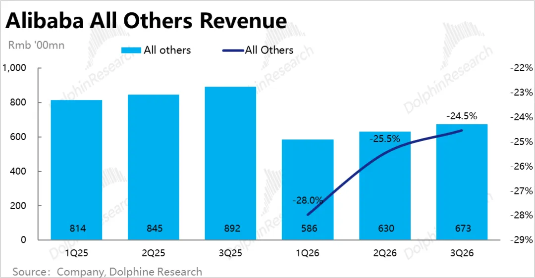 在上述三大板块之外,包括菜鸟、阿里娱乐、高德、千问和原先就在其他分类中的业务,本季收入约673亿,同比下降25%,主要还是剥离银泰和高鑫零售的影响,以及部分物流功能被对应前台业务部门如(自营零售和国际电商)接管的影响。