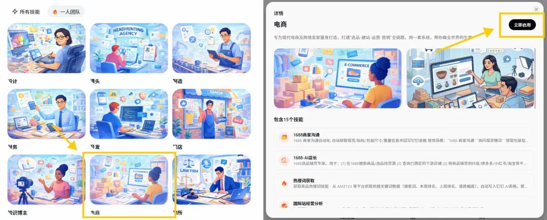 我们一起看一下实际跑下来的流程:打开悟空,在“一人团队”选项里点击“电商”板块,再点击“立即启用”下载该功能。