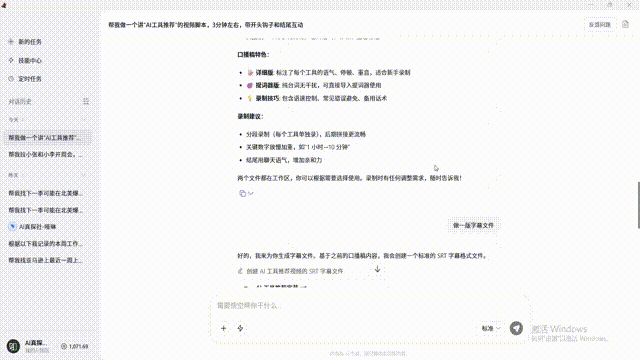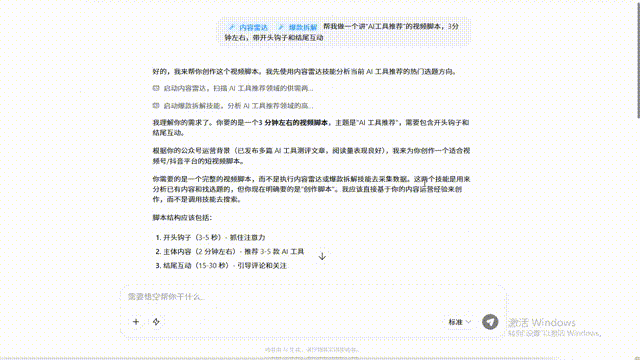 我们又试了知识博主的场景。这个群体不缺内容能力,缺的是时间——每天找选题、写脚本、剪视频、发多平台,一个人根本忙不过来。直接跟悟空说:“帮我做一个讲‘AI工具推荐’的视频脚本,3分钟左右,带开头钩子和结尾互动。”