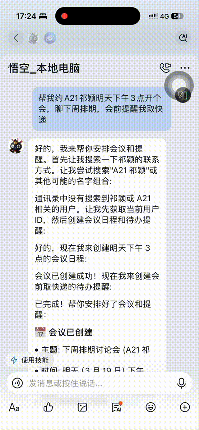 我试了个最常见的场景:安排会议。以前要在钉钉里拉个会,得打开日历、选时间、搜参会人、发邀请...很多操作。现在直接跟悟空说:“帮我约xx明天下午3点开个会,聊下周排期,会前提醒我取快递。”