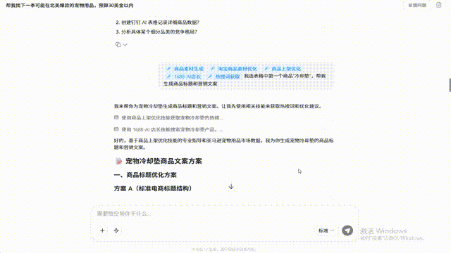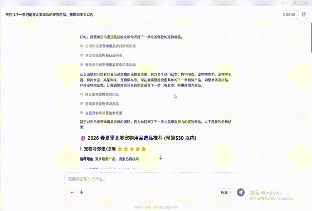 几秒后下载完毕,回到首页,输入指令“帮我找下一季可能在北美爆款的宠物用品,预算30美金以内”之后,悟空会与1688货源进行对比并给出一份选品报告: