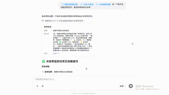 最后我让它“设一个每天自动监控的任务,看这款商品的点击率”。悟空把选品、文案、视频都填进钉钉表格,设置了定时监控: