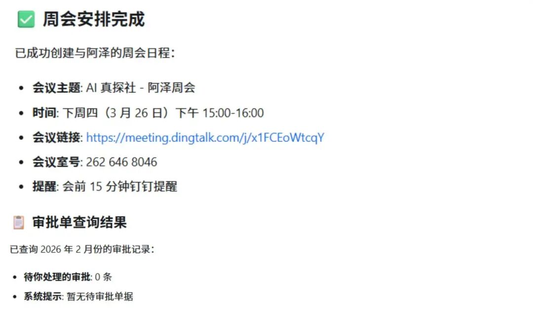 我又实测了一个场景:让悟空帮我拉阿泽开周会,顺便查一下上个月的审批单。悟空自动读取我的通讯录权限(只能看到我有权限看到的人),创建日程时自动避开了他的忙闲时间,还从审批后台调出没有需要我处理的审批单。