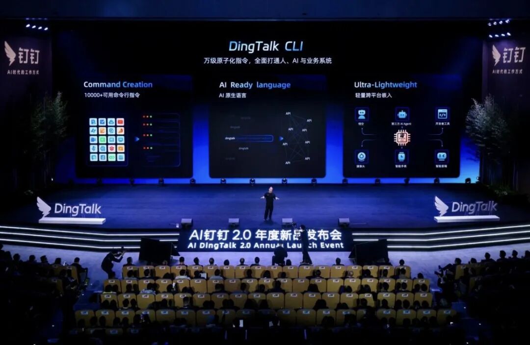 更深层的差异是:钉钉把整个自己“打碎”了。为了让悟空真正能干活,钉钉重写了底层代码,进行全面CLI化改造。翻译成白话就是:以前是人用鼠标点钉钉,现在是AI用指令调钉钉——IM、文档、日程、审批、会议……