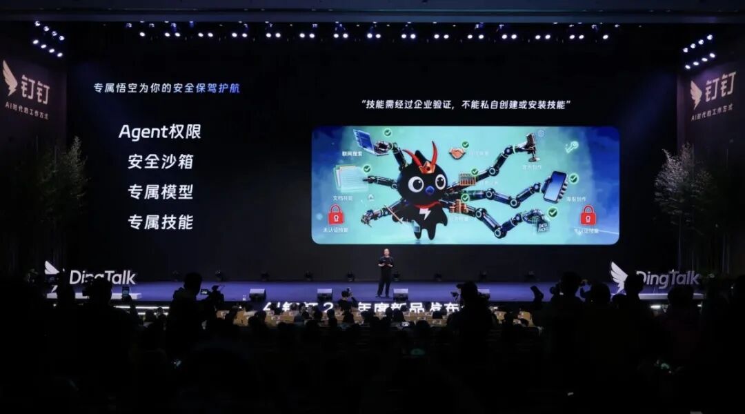 为什么是钉钉?第一,生产力场景需要成熟的商业场景沉淀——钉钉有8亿用户、2600万家企业的基础,知道真实的企业流程长什么样。第二,Agent要真正成为生产力,必须能碰到企业的真实数据、嵌入真实流程、在权限体系内执行——这套体系,钉钉天然具备。
