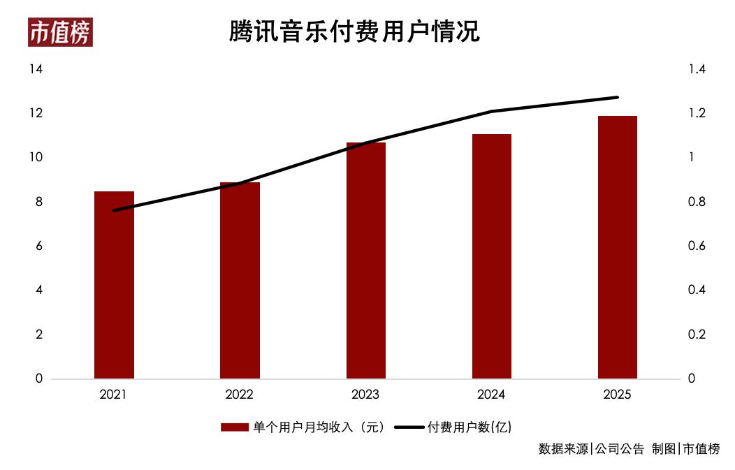 另一方面,在总用户盘子持续收缩的同时,腾讯音乐的付费用户数增长5.3%至1.274亿,单个付费用户月均收入(ARPPU)也提升7.2%至11.9元。超级会员数量也在2025年突破2000万。