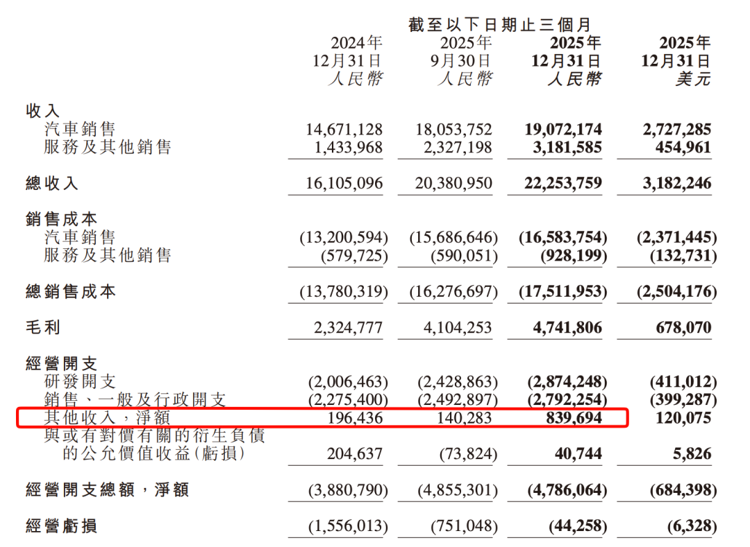 2025 年的最后三个月,小鹏汽车同样也实现了首次单季净利转正。但大头可能并非来自卖车,而是当季获得的 8.4 亿元“其他收入”推动——大部分是政府补贴。这算不上什么丢脸的事儿,特斯拉早年也是靠着补贴和倒卖碳积分过活——也算成全了“中国特斯拉”的名头。