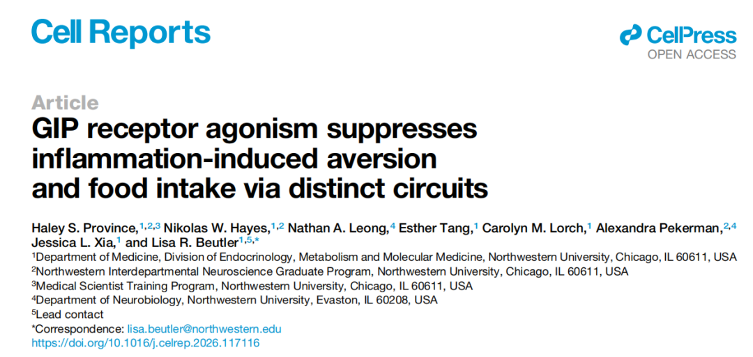 基于此,2026年3月18日,西北大学Lisa R. Beutler研究团队在《Cell Reports》杂志发表了“GIP receptor agonism suppresses inflammation-induced aversion and food intake via distinct circuits”揭示了GIP受体激动通过不同的神经环路抑制炎症引起的厌食和摄食减少。