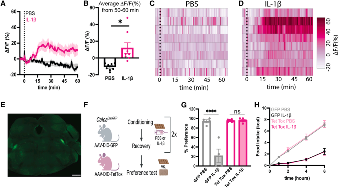 图一 IL-1β激活CGRP神经元,且这一过程是IL-1β诱导条件性味觉回避(CTA)所必需的