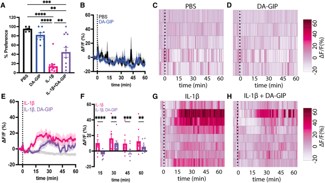 进一步用光纤记录发现,DA-GIP单独使用不会影响CGRP神经元的活性,但和IL-1β一起使用时,能显著抑制IL-1β诱导的该神经元激活。