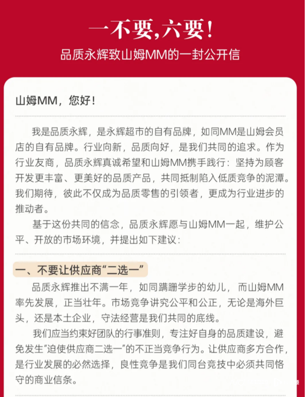 3月16日,永辉超市自有品牌“品质永辉”发布了致山姆MM(山姆Member's Mark)的公开信,呼吁山姆MM不要让供应商“二选一”。
