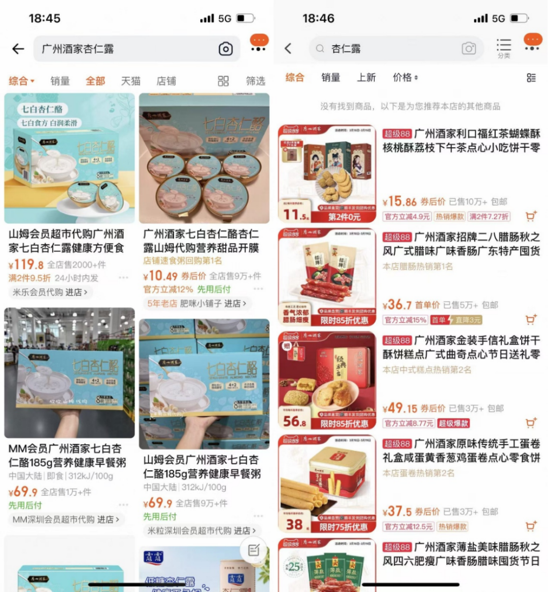 比如山姆与广州酒家合作定制的七白杏仁酪,我们在电商平台上搜索,发现只有山姆及代购在出售这款产品,广州酒家旗舰店以及其它商超渠道均不见在售。