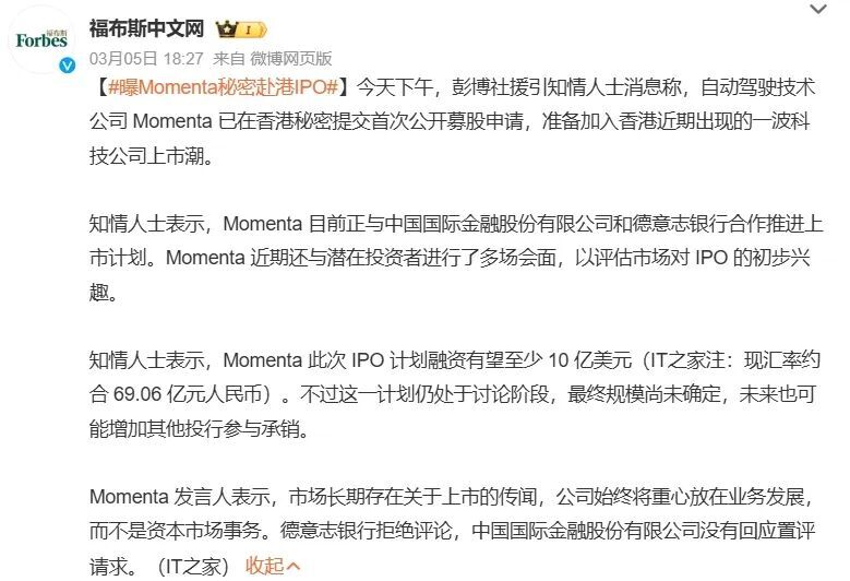 据媒体报道,Momenta已秘密向港交所递交上市申请,计划募集至少10亿美元资金,并已与中金公司、德意志银行等机构展开合作,后续或引入更多承销方;不过,Momenta方面对此回应称“暂无消息”。