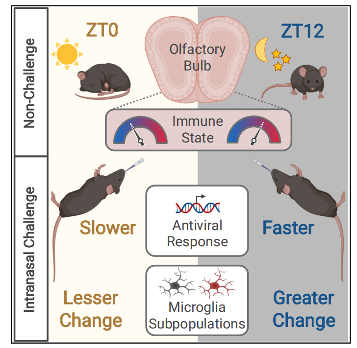 2026年3月20日,马萨诸塞大学Ilia N. Karatsoreos在《Cell Reports》发表题为:“Time of day alters olfactory bulb immune state with ramifications for intranasal inflammatory challenge”的研究工作。