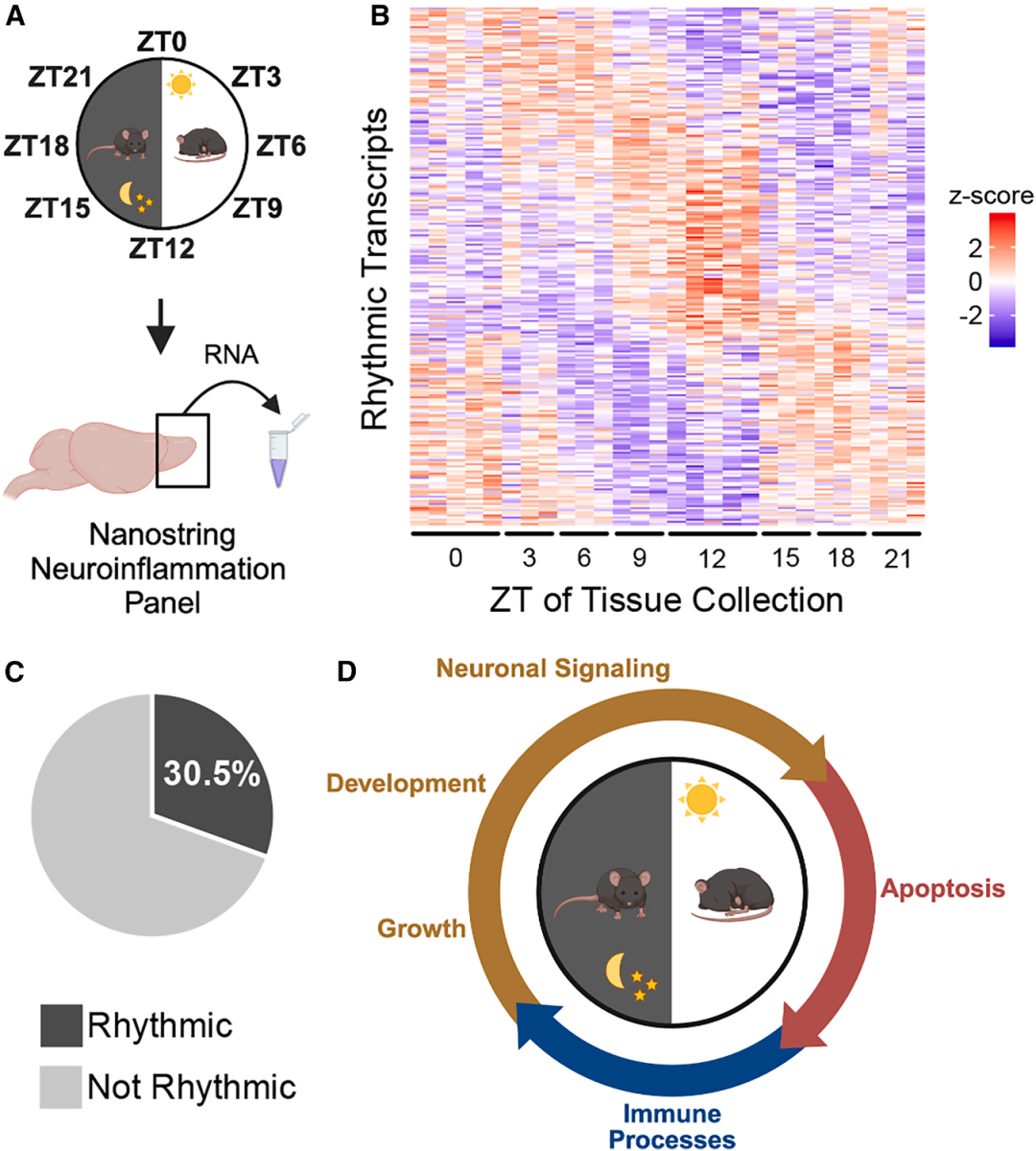 进一步按表达峰值时间分析显示,不同功能的转录本在昼夜不同时段有序富集,其中免疫相关转录本在黑暗开始期(傍晚)达到表达高峰,且主要参与抗病毒先天免疫与细胞因子应答等通路,这一时段也与小鼠对神经病毒感染抵抗力更高的特征相吻合,提示嗅球可通过昼夜节律协调神经炎症相关基因的时序表达,在夜间起始阶段增强免疫防御功能。