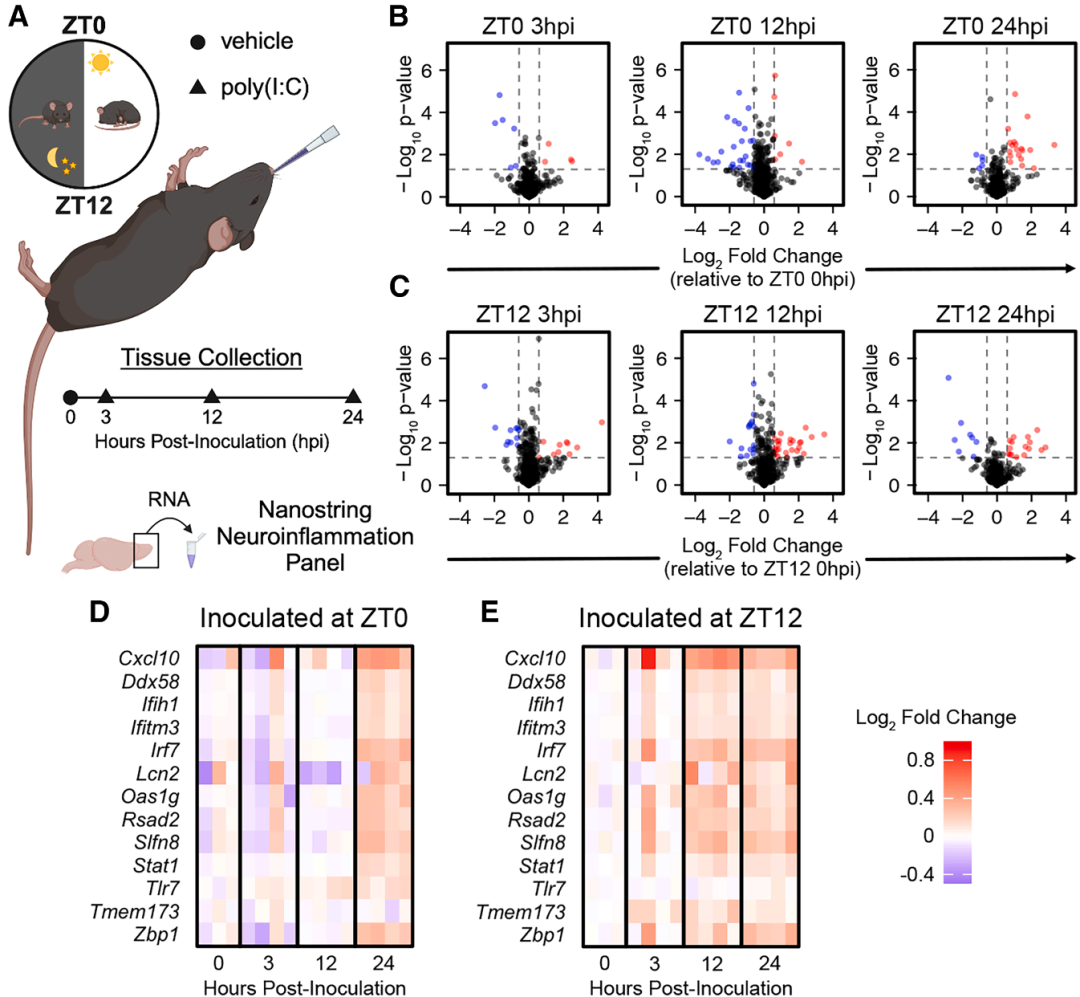 研究分别在ZT0和ZT12两个时间点对小鼠进行 Poly (I:C) 鼻内刺激,结果发现,给药后3-12小时,ZT12 组可更早诱导Ⅰ型干扰素与抗病毒相关基因表达,而 ZT0 组反而出现免疫相关基因下调;24 小时后两组反应趋于一致。说明昼夜时间可显著改变嗅球对急性鼻内免疫挑战的应答时序与强度。