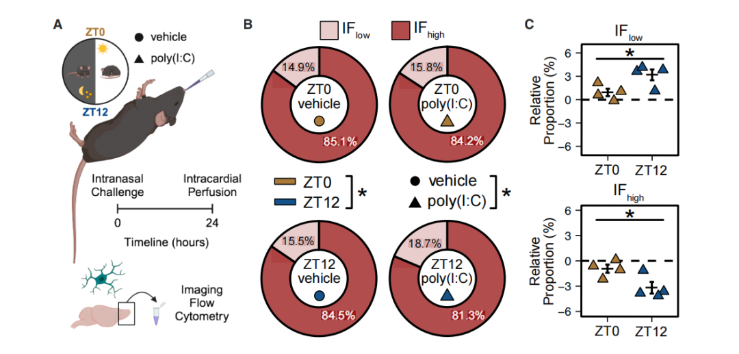 在ZT0或ZT12对小鼠进行鼻内Poly(I:C)刺激后24小时检测发现,单纯昼夜时间并不改变静息状态下小胶质细胞自发荧光亚群比例,而鼻内免疫挑战可显著升高低自发荧光小胶质细胞比例、降低高自发荧光亚群比例,且这一效应在ZT12刺激时远强于ZT0,提示小胶质细胞自发荧光水平可反映其受外界刺激后的功能状态,并受昼夜节律时间调控。