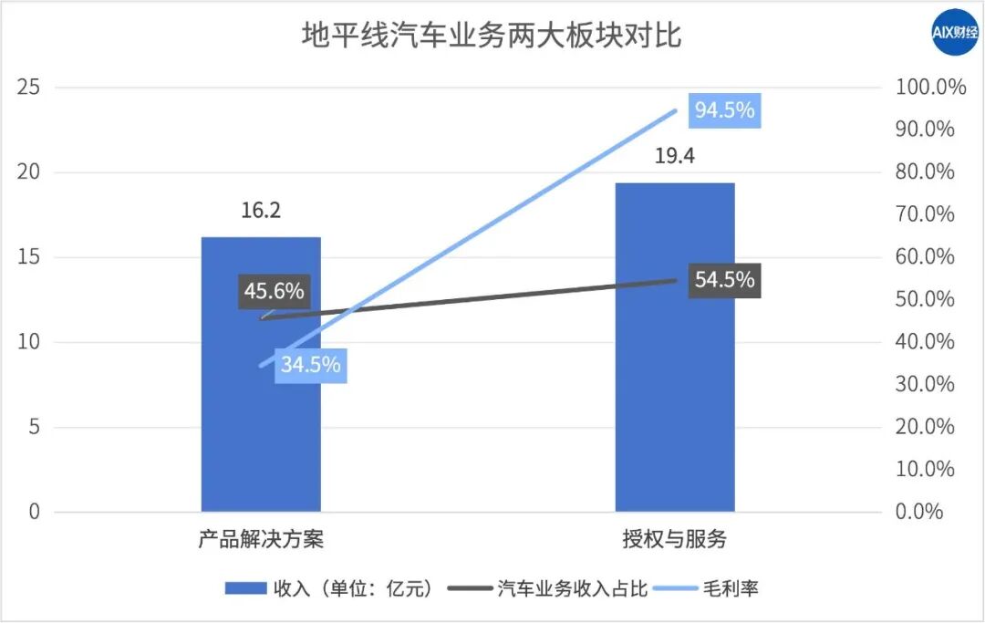 在汽车业务中,产品解决方案收入16.2亿元,同比增长144.2%,占汽车业务收入比重45.6%;而授权及服务收入19.4亿元,占比54.5%。两大业务从过去的三七开变成四六开,收入来源趋于均衡。
