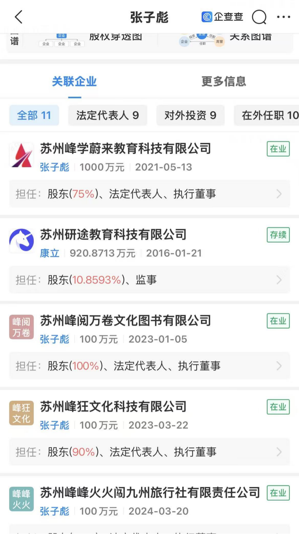 在这些关联公司中,注册资本1000万元的苏州峰学蔚来教育科技有限公司,以及注册资本超920万元的苏州研途教育科技有限公司,是他核心教育板块的重要载体,支撑着其教育IP的核心业务。