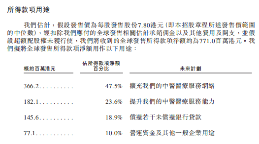 此次上市,公司计划将所得款项净额的47.5%(约3.66亿港元)用于扩充中医医疗服务网络,通过并购整合与轻资产新建,进一步完善全国布局,巩固龙头地位。