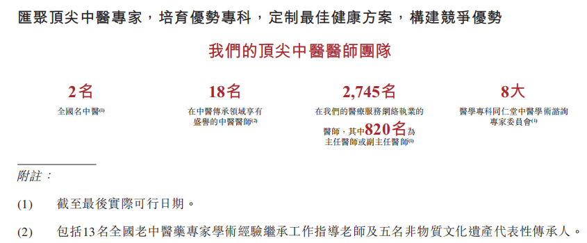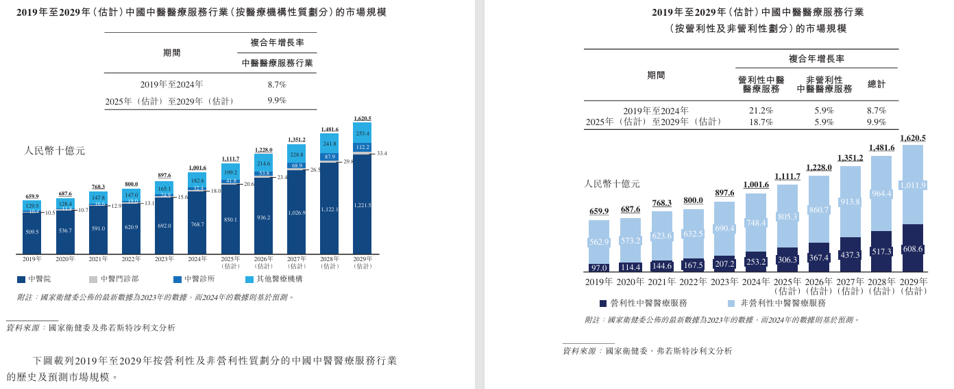 在极度分散的中医服务市场,公司已确立明确的龙头优势:按2024年总门诊人次及住院人次计,是中国非公立中医院医疗服务行业中最大的中医院集团,市场份额为1.7%;按同年中医医疗服务总收入计,排名第二,市场份额0.2%。