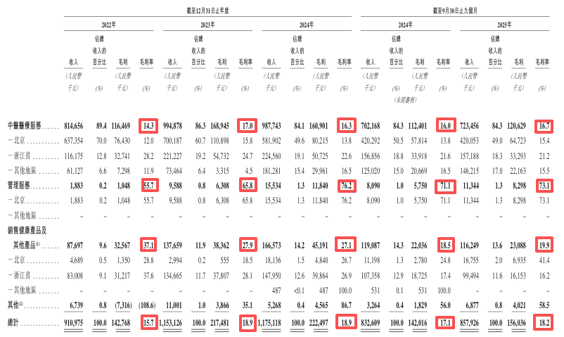 中医医疗服务作为压舱石,2022-2024年收入分别达8.15亿元、9.95亿元、9.88亿元,常年占据超八成营业收入,2025年前三季度进一步增至7.23亿元,核心医院贡献稳定,门诊人次持续领先。