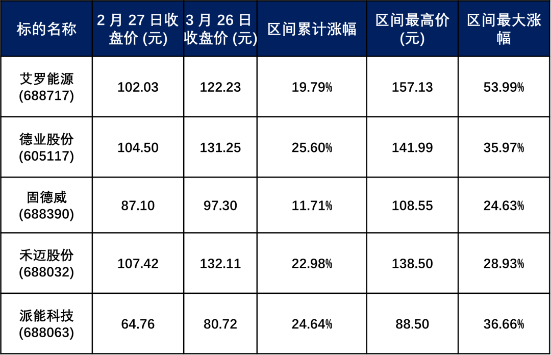 本轮新能源估值行情中,最超市场预期的,是此前增速预期偏低的户用储能板块。截至2026年3月26日收盘,2月28日冲突升级以来,A股核心户储标的股价涨幅显著领跑新能源板块,具体表现如下: