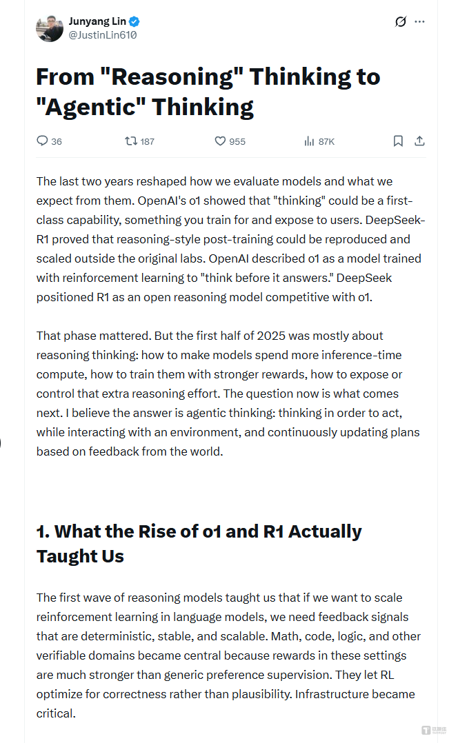 3月26日,被誉为“阿里最年轻P10”的千问(Qwen)大模型灵魂人物林俊旸,在月初离职风波舆论渐息之际(详见《阿里千问“换帅”风暴:林俊旸转身,大模型赛道告别英雄时代》),在X平台发布长文《从“推理式思考”到“智能体式思考”》,系统阐述了他对AI技术范式演进剖析。通过这篇文章,林俊旸不仅总结了过去,更指向了AI未来竞争的焦点——一个超越单一模型比拼、关乎系统、环境与协同的智能体新时代。