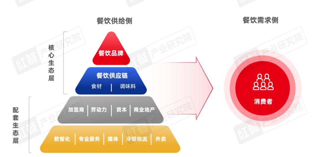 餐饮行业的健康发展依赖于供给侧生态体系的高效协同。该体系分为核心生态层与配套生态层:核心层以餐饮品牌为龙头,依托食材与调味料企业为代表的供应链体系,直接决定产品与服务的核心竞争力;配套层则涵盖劳动力、资本、商业地产等基础要素,以及数智化、专业服务、冷链物流、外卖等赋能环节,为行业发展提供全方位支撑。