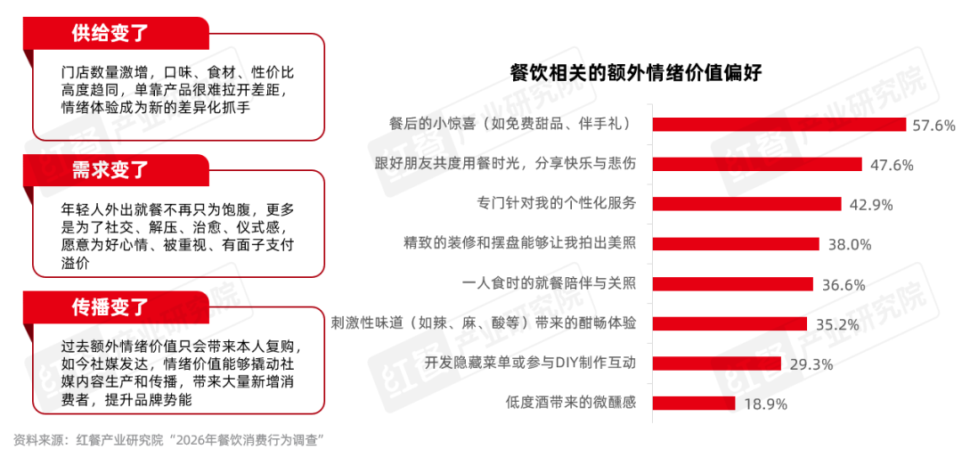 当前餐饮行业的供给、需求与传播环境已发生根本性变化,情绪价值成为品牌破局的关键抓手。供给端,门店数量激增,口味、食材、性价比高度趋同,单靠产品难以拉开差距;需求端,年轻人外出就餐不再只为饱腹,更多是为了社交、解压、治愈与仪式感,愿意为好心情支付溢价;传播端,社媒发达,情绪体验可带动社媒内容生产与广泛传播,大幅降低获客成本。