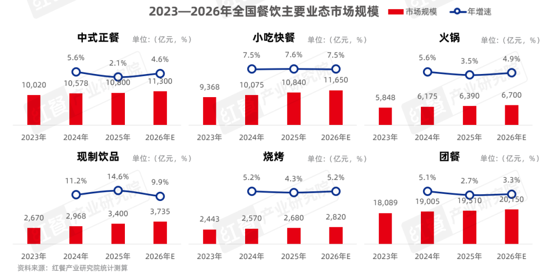 2025年,中国餐饮各细分业态呈现差异化增长态势。从市场规模来看,现制饮品增速亮眼,2025年增速达14.6%,市场规模预计突破3,400亿元,成为增长最快赛道。小吃快餐稳健扩张,规模达10,840亿元,中式正餐、火锅、烧烤、团餐增速相对平缓,团餐凭借刚需属性,2026年规模预计超2万亿元。