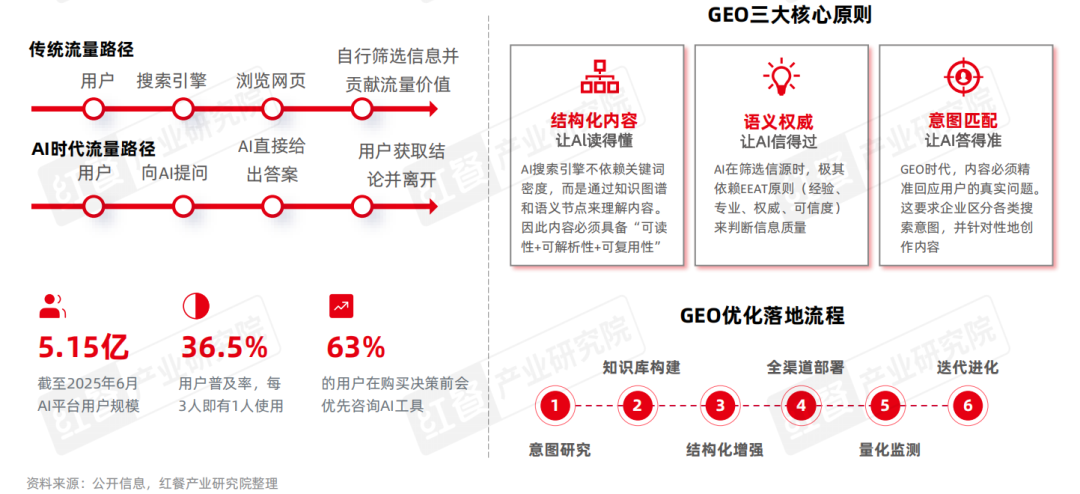 截至2025年6月,我国生成式人工智能用户规模达5.15亿人,较2024年12月增长2.66亿人。网络用户全面向AIGC平台迁移。GEO(生成式引擎优化,Generative Engine Optimization)通过优化内容的结构、权威性与语义表达,提升其被大模型识别、信任并引用的概率。