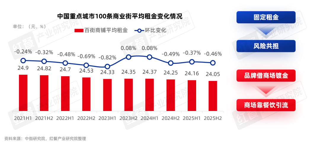 2025年商业地产整体进入“以价换量”周期,重点城市商铺租金延续下行态势。越来越多商场放弃传统收取固定租金的模式,采用“保底租金+流水扣点”的联营模式,甚至与头部餐饮品牌联合孵化新店、共建IP,从单纯的“房东”转向品牌共生的“合作伙伴”,降低了餐饮品牌的拓店风险。与此同时,商场与餐饮的关系从“品牌借商场镀金”转向“商场靠餐饮引流”,具备强引流能力的头部餐饮品牌,能在商场拿到更优惠的合作条件。