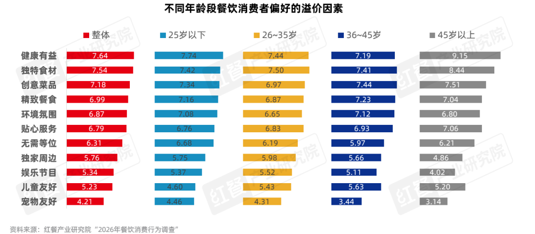不同年龄段餐饮消费者对溢价因素的偏好呈现显著差异,但健康有益、独特食材和创意菜品仍是驱动整体消费溢价的核心因素,整体消费者评分均超过7分。