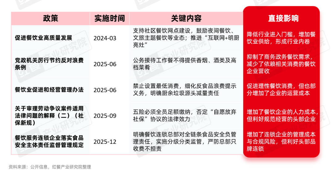 在政策层面,2024—2025年,国家围绕餐饮行业出台了一系列政策,对行业格局产生了深远影响。这些政策在推动行业规范化、高质量发展的同时,也加速了行业洗牌,倒逼餐饮企业加速转型以应对挑战。