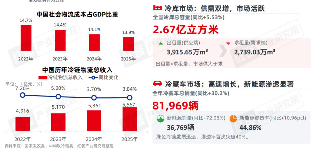 中国物流成本占GDP比重已从2022年14.7%持续下降至2025年13.9%。冷链物流总收入在2025年达到5,567亿元,同比增长3.84%。在“两重”“两新”等补贴政策的支持和引导以及市场需求的驱动下,冷库规模稳步增长。2025年,全国冷库总容量为2.67亿立方米,同比增长5.53%;2025年全年冷藏车销量为81,969辆,同比增长30.2%。