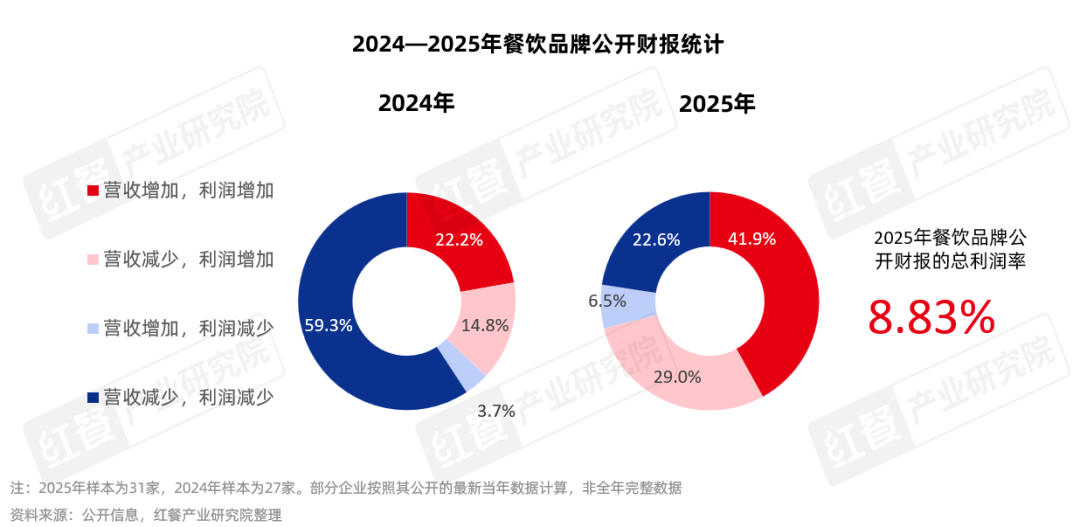 在盈利结构方面,根据2025年餐饮品牌公开财报数据,行业盈利结构较2024年出现显著优化。“营收增加、利润增加”的品牌占比从22.2%提升至41.9%,“营收减少、利润增加”的品牌占比从14.8%提升至29%,而“营收增加、利润减少”的品牌占比从3.7%增至6.5%,“营收减少、利润减少”的品牌占比从59.3%大幅降至22.6%。行业总利润率达到8.83%,餐饮企业整体盈利能力显著增强。