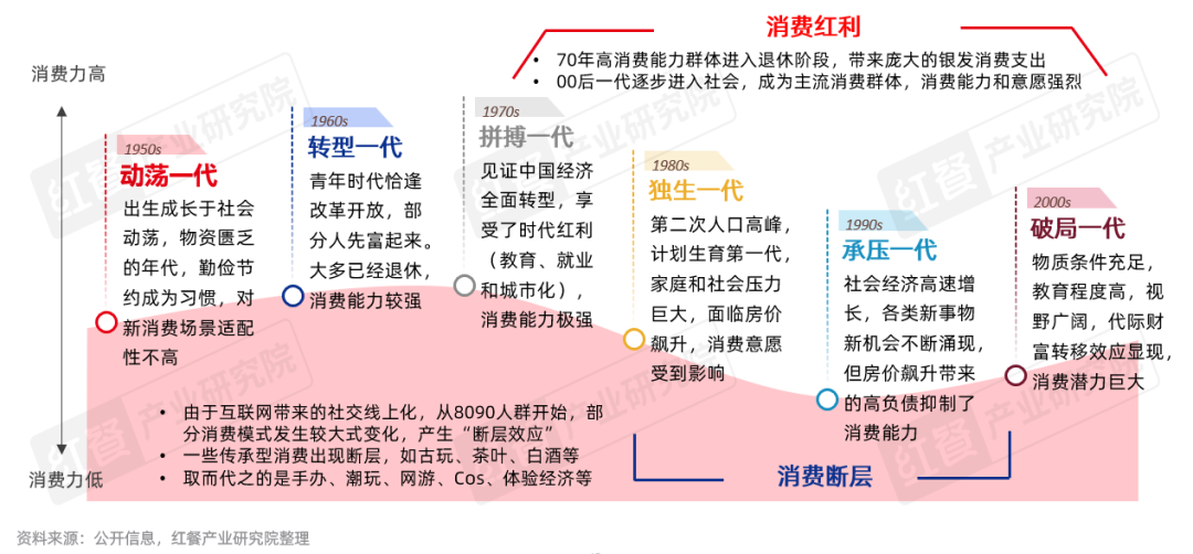 当前餐饮行业正面临代际消费模式的断层与新消费红利的双重机遇。8090后作为互联网原生代,其社交与消费习惯线上化,打破了许多传统传承的消费模式;同时,他们作为计划生育第一代,面临家庭与社会双重压力,消费能力受限且更趋理性,形成了明显的消费断层。