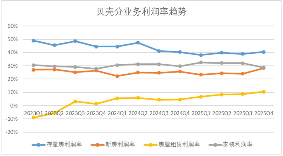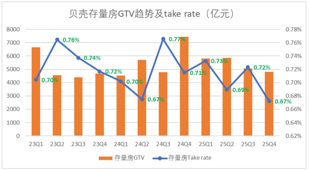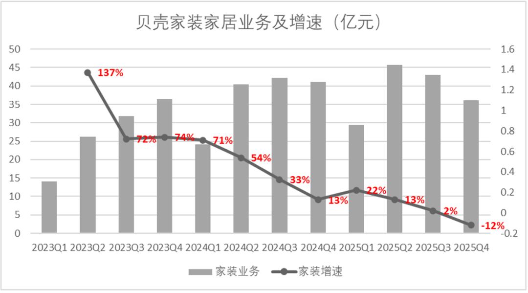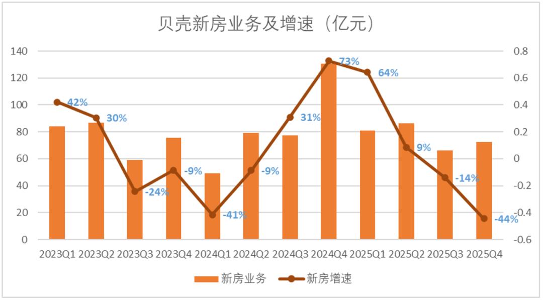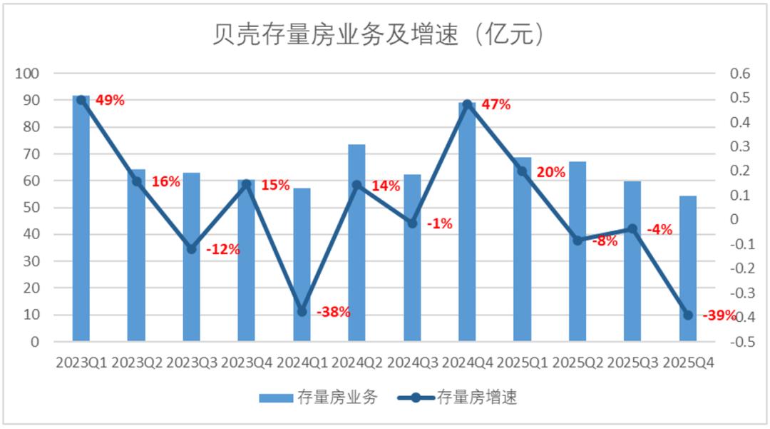 相对于新房业务的低预期(过去数年中国地产开发投资额降幅较明显),存量房业务一直以来是贝壳相对稳定的压舱石,相对波动要小于新房业务波动。但是2025年四季度贝壳存量房业务创造了自2023年以来的单季度同比最大跌幅。