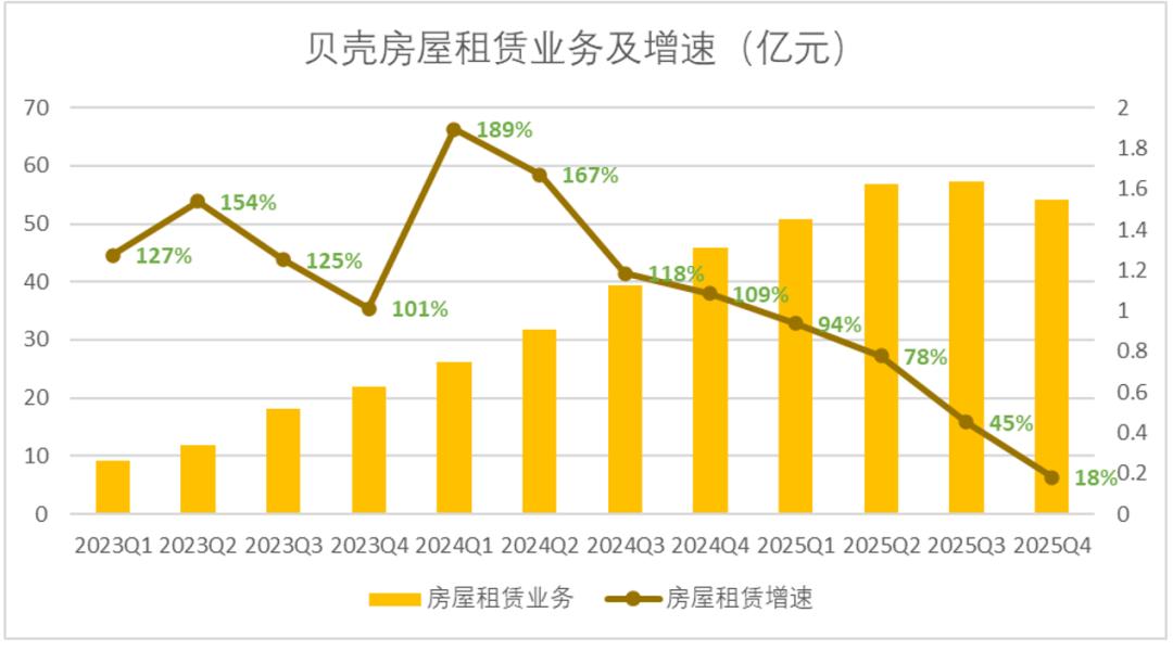 四季度贝壳房屋租赁业务的营收录得54.11亿元,同比增长了18%,虽然增速也在下滑,但已经是四个业务中唯一录得正增长的业务。