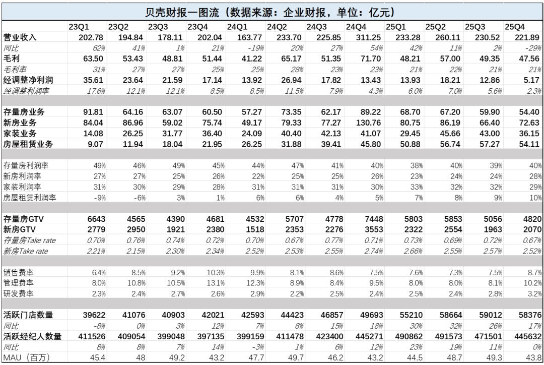 上周,贝壳披露了第四季度财报,营业收入录得222亿元,单季度同比大幅下滑29%,全年实现收入946亿元,较2024年的935亿元微增1.2%,但四季度调整后净利润仅录得5.17亿元,同比下滑61.5%,经调整净利润率仅为2.3%,财报一图流如下图所示: